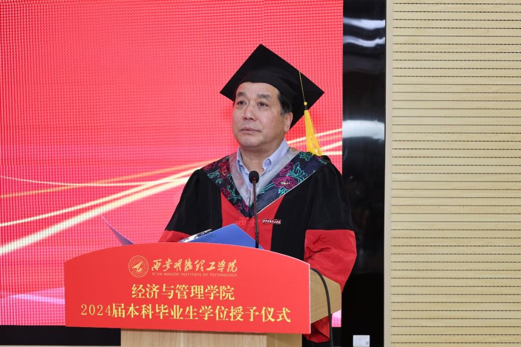 6月25日下午,经济与管理学院2024届本科毕业生学位授予仪式在建德楼201隆重举办。学校党委副书记、纪委书记、副校长白秦川,经济与管理学院院长郭鹏、党委书记兼行政副院长何文举、副院长许萍、副书记冯纪潮及各专业负责人、教师代表、家长代表、2024届毕业生共同见证了这一重要时刻。学位授予仪式由何文举主持。