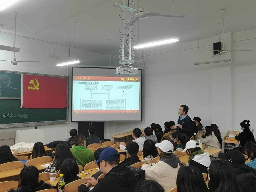 课前,学生第一党支部书记罗夫惠就第二季信仰公开课教学安排向同学们做了说明。紧接着,学生第三党支部书记井小林向在场的同学们讲了题为《十九届六中全会精神解读》的公开课,带领大家从《中共中央关于党的百年奋斗重大成就和历史经验的决议》提出的背景及其意义、主要内容和对当代青年的启示等三个方面重点学习了《决议》。讲课过程中,井小林结合党的百年奋斗历程和取得的伟大成就鼓舞学生斗志,引导他们要始终坚定理想信念,怀着“请党放心,强国有我”的青春誓言接续奋斗。在场学生纷纷表示,将个人理想融入党和国家的事业发展中去,矢志奋斗、积极进取。